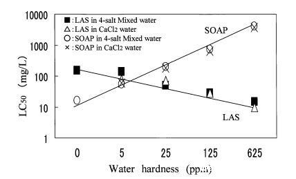 在预试验中,大型水蚤在4盐混合溶液中存活,但在CaCl2?H2O溶液或蒸馏水中不能存活。 另一方面,角鲨在所有3种水中都能存活。 因此,使用podocopida研究了水硬度成分对LAS和肥皂毒性的影响。 如图3所示,CaCl2?H2O溶液和4-盐混合溶液的毒性值没有差异。 肥皂的毒性随水硬度的增加而降低,LAS的毒性随水硬度的增加而增加。