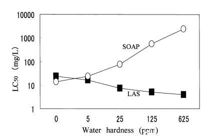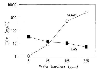 图5在4-盐混合水中,水硬度对LAS和肥皂对大型水蚤的急性毒性的影响。