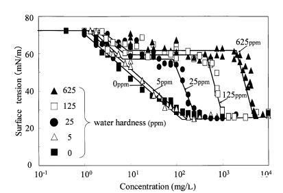 图7水硬度对肥皂表面张力曲线的影响。