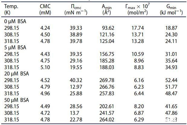 表1.[C10-4-C10im]Br2在不同温度下存在不同浓度BSA时的界面参数。
