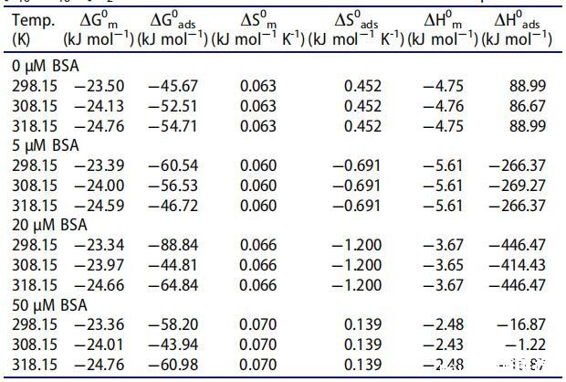 表2. [C10-4-C10im]Br2在不同温度下吸附和胶束化的热力学参数与BSA浓度的关系。