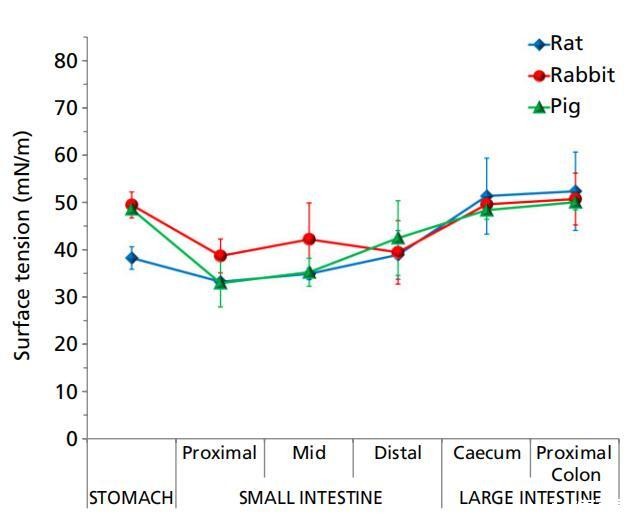 大鼠、兔和猪的胃肠液在整个肠道的表面张力明显低于水的表面张力。这些动物的表面张力遵循一般模式,胃的表面张力较高,小肠的表面张力较低,而远端肠道的表面张力再次升高(图3,表1)。这种表面张力的行为也与肠道内的消化过程相一致。小肠环境中的消化营养物(如葡萄糖、氨基酸、脂肪酸)和消化分泌物(如胆汁)降低了该区域液体的表面张力,然后在远端肠道中重新吸收,从而产生更高的表面张力。