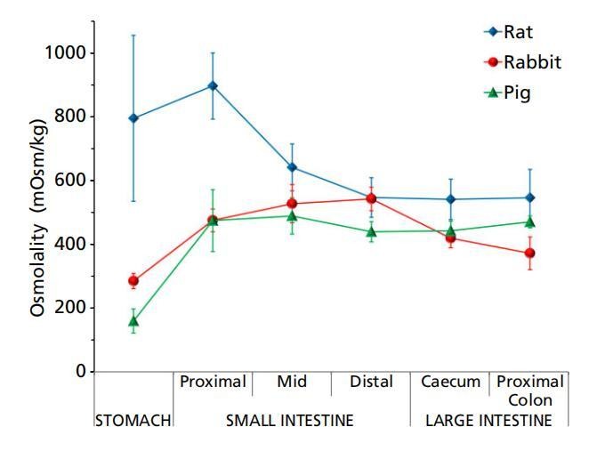 当渗透压数据与已发表文献中的人体数据进行比较时,观察到了有趣的趋势。Kalantzi及其同事报告,在摄入液态膳食(Sure Plus)30分钟后,人类胃液的渗透压为559 mOsm/kg,高于喂养条件下兔子和猪胃液的渗透压。然而,这与大鼠的胃渗透压相似(表1)。研究还发现,研究前摄入的液体膳食的渗透压(Sure Plus,610 mOsm/kg)对人体胃液的渗透压有很大影响,因此,摄入30分钟后,胃液的渗透压(559 mOsm/kg)密切相关。进食210分钟后,可能在胃排空后,这一水平降低到217 mOsm/kg。人十二指肠吸出物的渗透压为∼400mosm/kg,相对低于大鼠、兔和猪;然而,它与猪(492±102 mOsm/kg)和兔子(475±36 mOsm/kg)相当。还应注意的是,我们在动物身上的测量是在上清液上进行的,而Kalantzi等人使用的是整个胃和十二指肠抽吸物。禁食条件下人类空肠吸出物的渗透压显著低于喂养的大鼠、兔子和猪。[18]来自人类升结肠液的上清液[19]也显示出显著低于我们在大鼠、兔子和猪中测量的渗透压(224 mOsm/kg)。