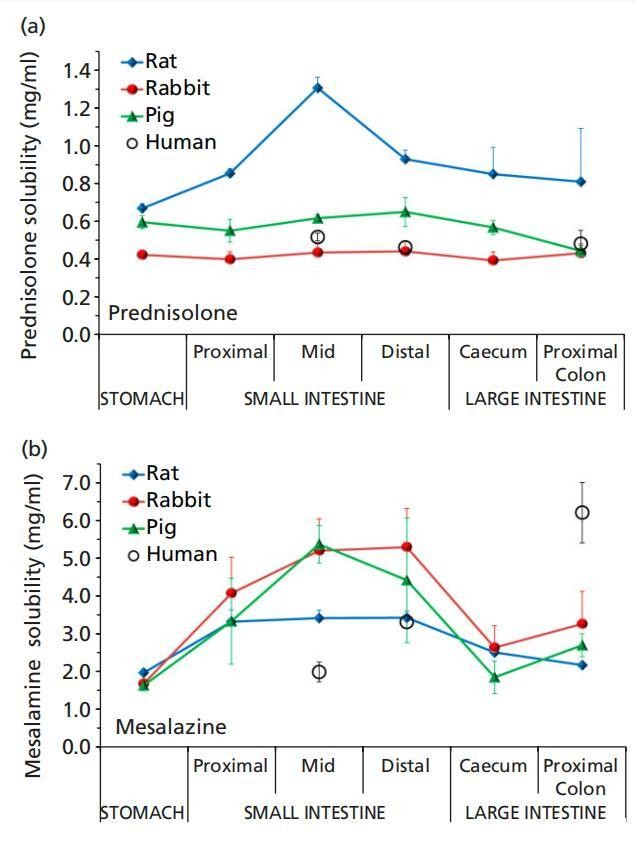 图4(a)泼尼松龙和(b)美沙拉秦在大鼠(8只大鼠)、兔子(n=6)和猪(n=3)胃肠液(上清液)中的溶解度,Fadda等人的人类数据。[11]
