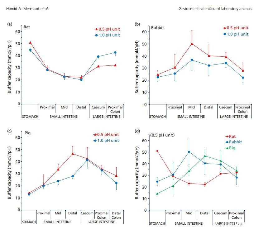 图1(a)来自大鼠(n=3),(b)兔子(n=6),(c)猪(n=3)的混合样品的胃肠液(上清液)缓冲容量(平均值±标准偏差(SD)),在pH单位变化0.5和1.0时测量,以及(d)整个胃肠道缓冲容量的种间趋势。