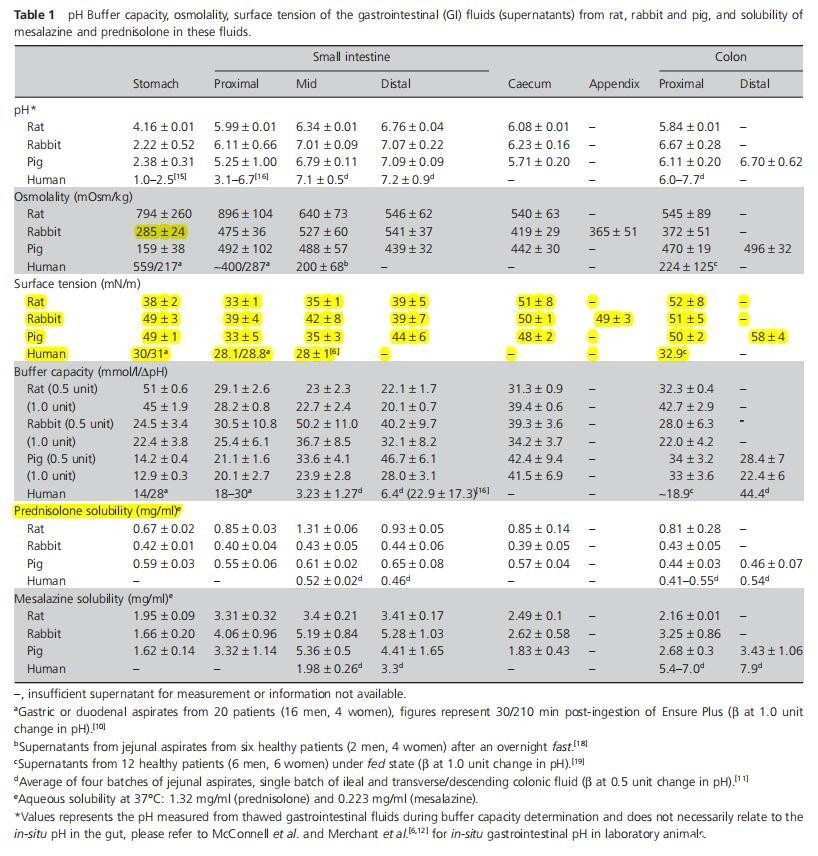 表1大鼠、兔和猪胃肠液(上清液)的pH缓冲容量、渗透压、表面张力以及美沙拉秦和泼尼松龙在这些液体中的溶解度。