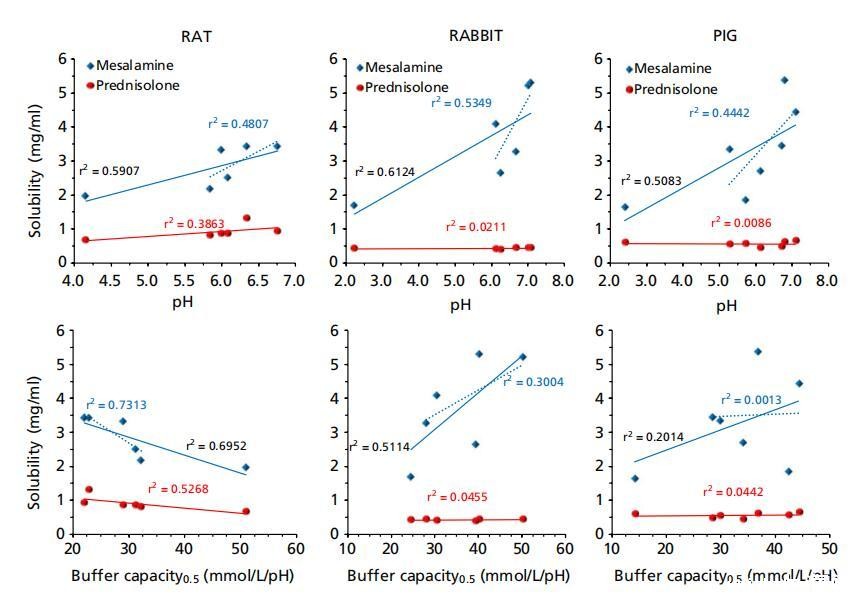 需要注意的是,Fadda等人[11]报告了使用体液的相关性 未考虑胃液中的溶解度,这在此处介绍的动物液中的相关性中得到了解释。有趣的是,在排除动物液中的胃溶解度后,人和动物液中的相关性变得相似(图5中的虚线) 此外,尽管区域pH值和缓冲容量较高,但猪远端小肠的平均溶解度并不高于中小肠(表1),这可以通过该区域较高的表面张力(44±6 vs.35±3)来解释 表面张力与美沙拉秦在兔子体内的溶解度之间存在一定的亲和力(标准化系数β)= − 0.802,P=0.055;r2=0.643)。需要注意的是,用于产生这些相关性的pH值对应于液体上清液中的测量值,这不一定与肠道中的原位pH值相关。