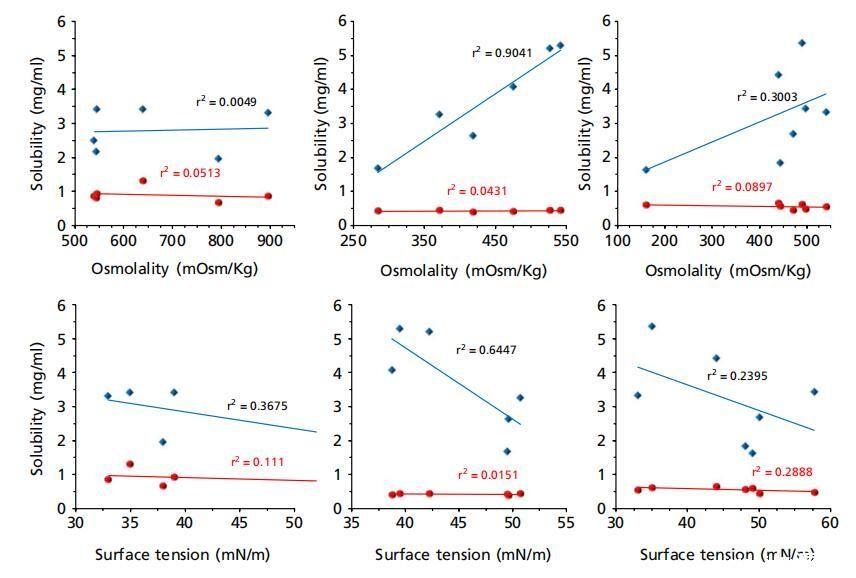 图5:美沙拉秦(蓝色钻石)和泼尼松龙(红色圆圈)在大鼠、兔和猪胃肠液(上清液)中的溶解度与其pH值、缓冲容量、渗透压和表面张力的函数关系,其中蓝色虚线表示除胃液外的美沙拉秦相关性。