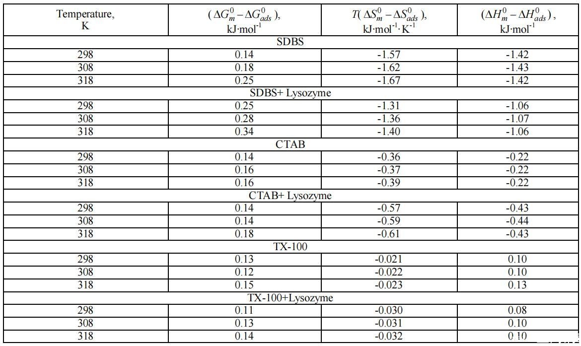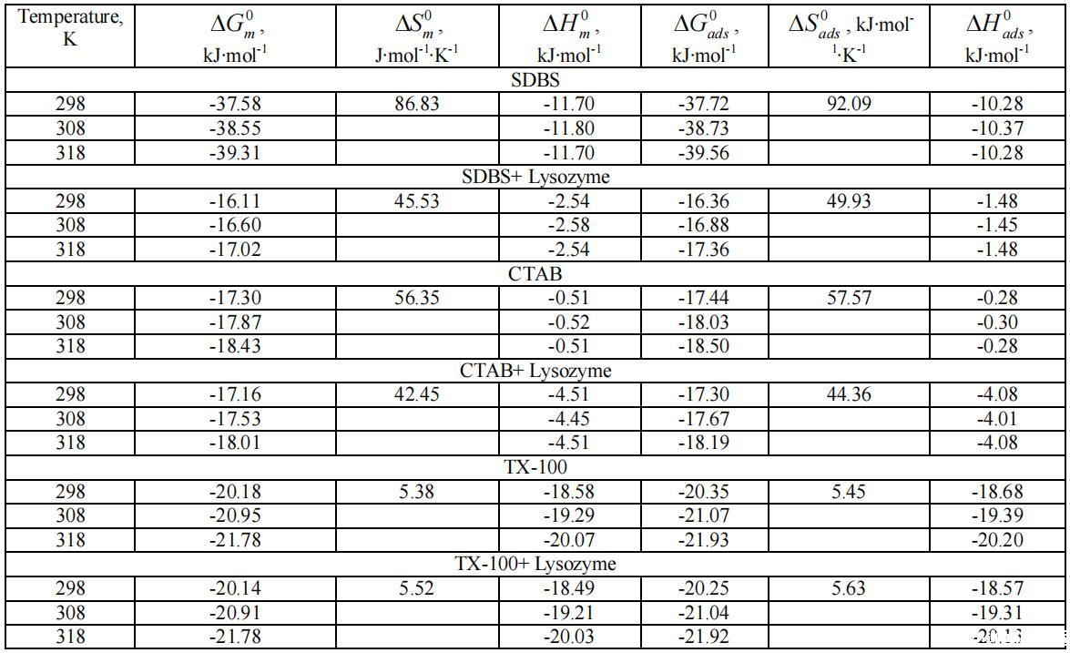 在溶菌酶存在和不存在的情况下,不同种类表面活性剂的物理化学和热力学性质如下所述: