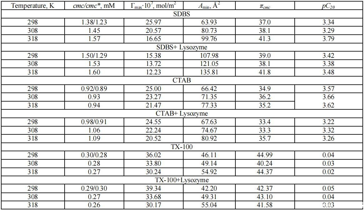 Γmax和Amin的值如表1所示。Γ最大值随着温度的升高而减小,其中随着Amin值的增加。因此,如果三种表面活性剂均为纯表面活性剂,并且存在溶菌酶,则这两个因素相互补充,这表明这些系统同时涉及静电和疏水作用[28]。在离子表面活性剂的情况下,与CTAB相比,SDBS的Γmax值下降更多,这表明SDBS和溶菌酶之间形成的复合物比CTAB和溶菌酶更有利。同时,阿明的增加与Γmax相反。