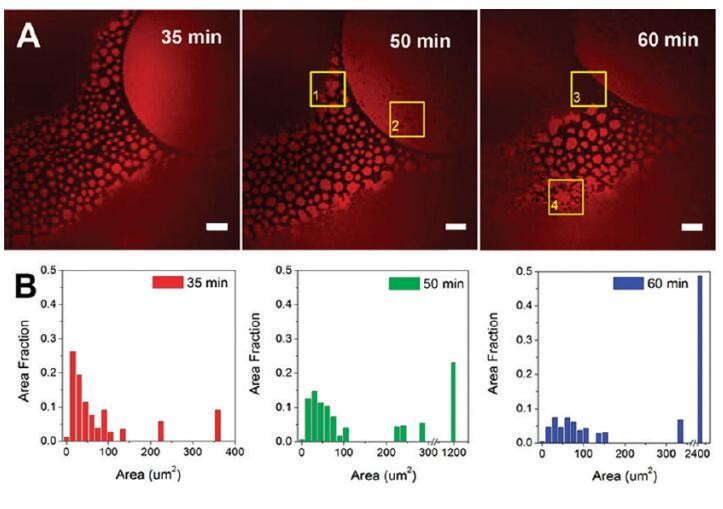 图5。蛋白质岛随时间的聚合。(A)导入后35、50和60分钟拍摄的共焦荧光图像。比例尺:20μm.(B)蛋白质岛大小分布的直方图。初始亚期浓度为[HSA-TR]=0.50 mg/mL和[F-127]=0.015 mg/mL。ROI-1表示一个区域(黄色框),其中小的蛋白质岛与周围的蛋白质岛结合形成一个较大的岛;ROI-2表明该区域形成了小黑洞;ROI-3表示在表面活性剂富集区域的边界处的运动;ROI-4显示了小的蛋白质岛合并成网状网络的地方。