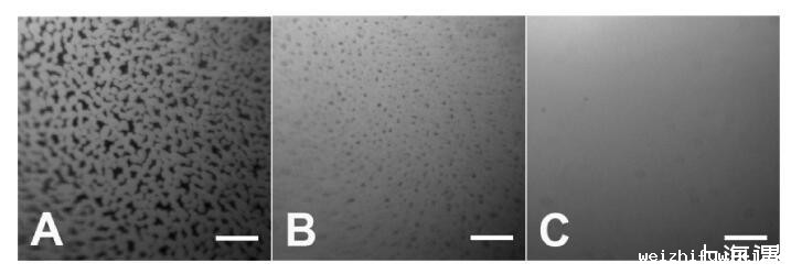图3。显示异质结构域转变为同质层的荧光图像。C(HSA-TR)=PBS中的0.01 mg/mL,pH值7.2,离子强度=530 mM。(A)3、(B)8和(C)将蛋白质溶液引入试验箱后36分钟。标尺:50μm。