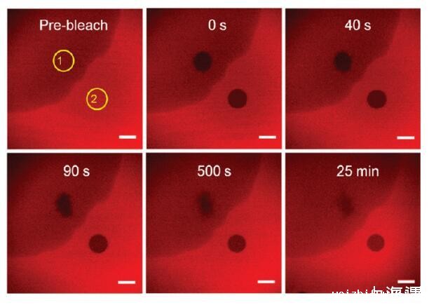 图4。界面层光漂白后的荧光恢复。ROI(黄色圆圈)是选定的光漂白区域。ROI-1位于富含表面活性剂的区域,而ROI-2位于富含HSA TR的区域。初始亚相浓度为[HSA-TR]=0.10 mg/mL和[F-127]=0.0050 mg/mL。比例尺:20μm。