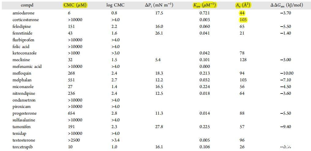 式中,π对应于表面压力,C对应于化合物浓度。(ii)CMC:对应于最大表面压力下平台截距和曲线外推斜率的临界胶束浓度(∂π/∂lnc)处于拐点(图3)。(iii)ΔΔGam:式3中的两亲性