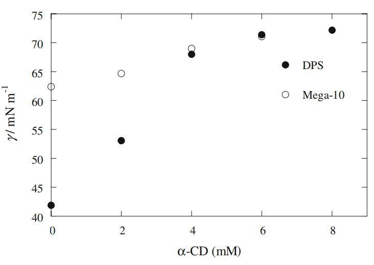 图1恒定2 mM浓度下Mega-10和DPS的界面张力(γ)变化与α-CD浓度的关系图