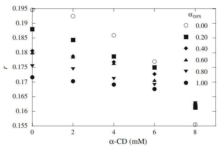 根据方程式15,我们计算了在不存在和存在α-CD的情况下当前二元混合物的胶束组成(X1)。图9显示了混合胶束(X1)和体积摩尔分数(α1)中表面活性剂的组成。从图9可以得出结论,在αDPS=0.2时,混合胶束中DPS的组成接近40%。存在α-CD时的X1值始终低于水的X1值。这种行为可能反映出α-CD通过降低其结合最强的表面活性剂的量来改变成分(见Ka值)。一般来说,CDs不与胶束相互作用,但CDs可能通过与溶液中的表面活性剂相互作用影响胶束的组成,从而改变胶束的平衡和组成。荧光各向异性为了研究混合胶束中两种不同组分的行为,我们还使用RB作为荧光探针进行了偏振荧光测量。这种探针在胶束介质中已经得到了很好的表征[33]。探针荧光发射的去极化程度是其激发态寿命期间旋转扩散的度量。荧光各向异性(r)通过Perrin方程与探针周围的粘度相关,如下[34]: