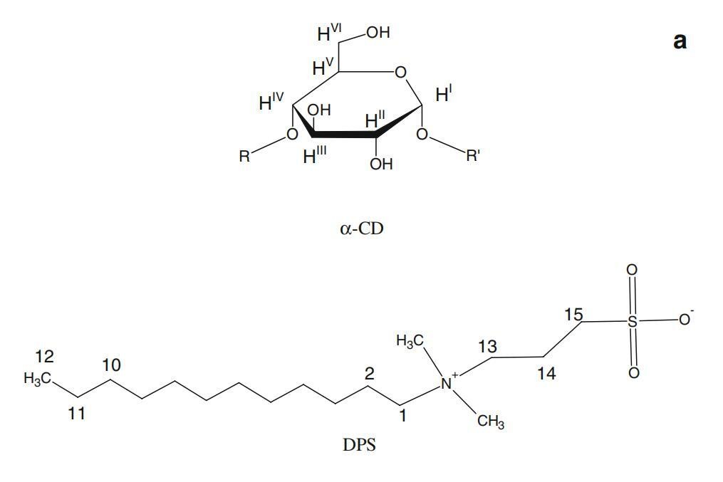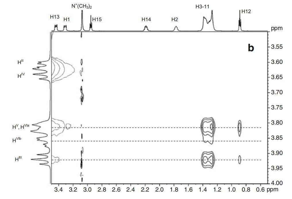 图7a显示了α-CD、DPS和Mega-10的示意图,以简化表面活性剂原子与CD原子的相互作用。2DROESY数据证明表面活性剂的烷基链包含在α-环糊精的疏水腔中。光谱如图7b和c所示。可以看到表面活性剂共振与位于环糊精空腔内的HIII、HV和HVI共振的交叉峰。未观察到分子(HI、HII和HIV)外部与环糊精原子的相互作用。对于这两种表面活性剂,与HIII和HV的相互作用似乎覆盖了从末端甲基到H3的整个烷基链。这意味着几个不同的复杂几何形状和穿透深度之间的快速交换。在镉原子和亲水性头基之间没有观察到相互作用。