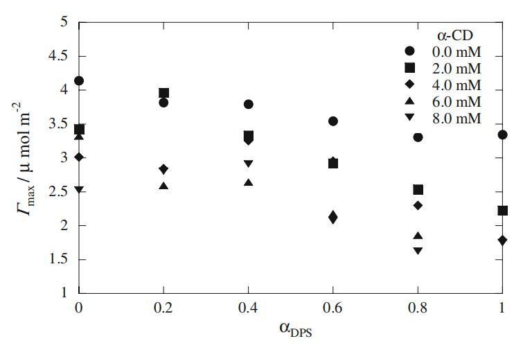 图4 Mega-10+DPS混合体系在水中和不同α-CD浓度下的表面过剩(Γmax)与α-DPS的曲线图