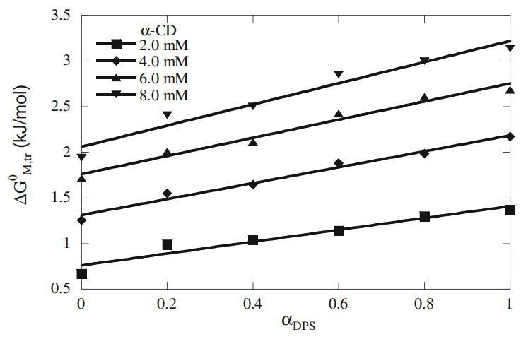 根据cmc值,我们评估了纯表面活性剂系统和混合表面活性剂系统在不存在和存在α-CD的情况下的胶束化标准自由能(数据未显示)[27],随后,通过胶束转移标准自由能评估添加剂对胶束化的影响(∆GM,tr 0),从水相到含有α-CD的水相[19]。这些值如图5所示,在不同α-CD浓度下,在整个DPS摩尔分数范围内为正值,表明α-CD的存在使胶束形成不利。此外,这些值随着α-CD浓度的增加而线性增加,在高α-CD浓度下斜率更高,表明混合胶束的形成延迟。
