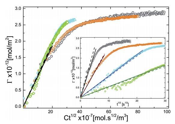 图5吸附量(G)作为产品Ct1/2的函数。插图显示了不同体积浓度的微凝胶颗粒的G与t1/2的单独曲线:(>)0.10 G l-1,(D)0.20 G l-1,(,)0.50 G l-1,(B)1.00 G l-1。实线是直线拟合,虚线是使用D=DDL计算的坡度绘制的。