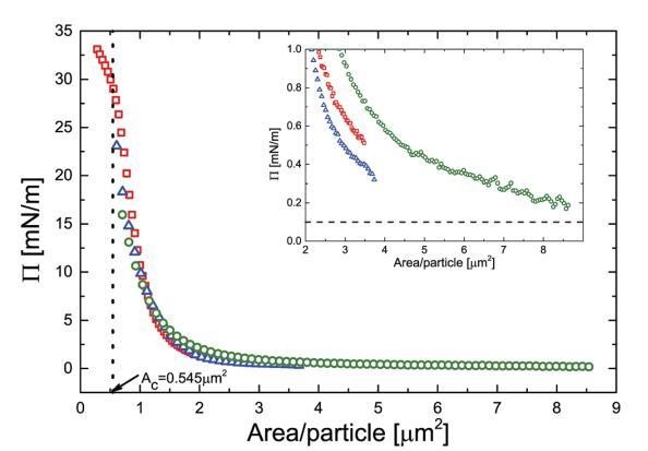 压力-面积等温线是通过在Langmuir槽上对扩散单分子膜进行3组不同实验得到的。这些等温线中的面积坐标根据吸附在界面上的颗粒数量进行缩放。如图1所示,所有曲线都折叠到一个图上。在增加压缩时,压力最初略有变化,但低于2 mm2/颗粒时,压力急剧增加。曲线的斜率首先增加,但在约27 mN m-1处达到最大值,在此有一个拐点,然后是一个稍弱的斜率。如图1中的虚线所示,对应于该拐点的每粒子面积(Ac)值为0.545 mm2。假设粒子紧密堆积,这对应于~835 nm的粒子间距离,远大于在本体溶液中测量的粒子流体动力学直径(590 nm),表明粒子确实发生了实质性变形。如图1的插图所示,0.5 mN m-1级的有限表面压力(即远高于我们的检测极限0.1 mN m-1)实际上已经可以在约4 mm2的每粒子面积上测量。插图还表明,在两个不同的朗缪尔槽上进行的不同实验之间,P的绝对值在0.3 mN m-1范围内可重复。