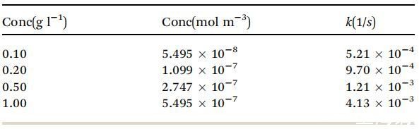 表2根据图6中的实验曲线计算的各种浓度的速率常数k(1/s)值