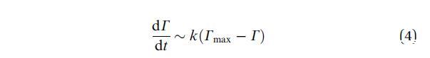当系统接近饱和时,G(t)的下降速度必须随着表面变得拥挤而减慢。吸附质浓度刚好低于表面,然后与吸附物种失去平衡,动力学受到吸附屏障的限制。一级动力学过程会导致: