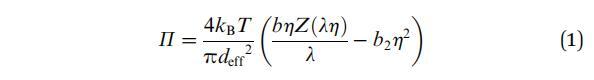 吸附在流体-流体界面上的颗粒相互作用并产生表面压力(P),这是3D系统中压力的2D模拟。通过进一步扩展这种类比,还可以通过状态方程将表面压力与其他状态参数(如数密度和温度)联系起来。对于吸附在流体-流体界面上的胶体粒子,最简单的近似可能是2D硬盘。单组分系统的状态方程(EOS)是根据压缩因子Z的密度依赖性给出的。文献中充满了多种方法来提供2D硬盘流体状态方程的表达式。Mulero等人27,28简要回顾和比较了所有这些状态方程。