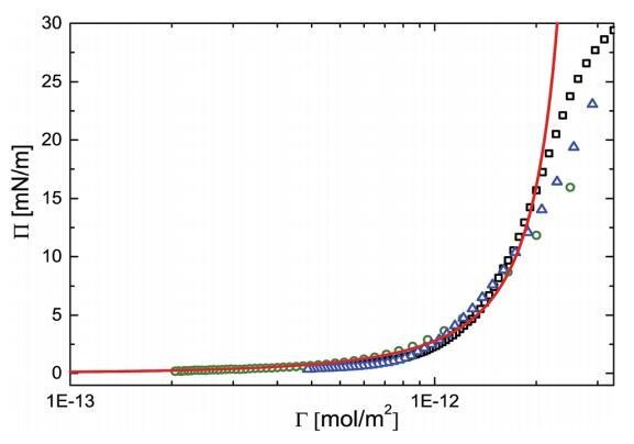 图2表面压力(P)与空气-水界面上PNIPAM颗粒吸附量(G)的关系。开放符号表示与三组不同实验相对应的实验数据点,即:(,)具有高初始颗粒负荷的NIMA槽,(B)具有低初始颗粒负荷的NIMA槽和(D)具有高初始颗粒负荷的Kibron m槽。红色实线表示使用Groot和Stoyanov模型进行的预测。
