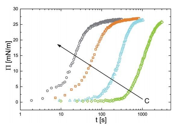 在建立了一个状态方程来关联表面压力和吸附量之后,我们现在开始研究粒子的吸附动力学。为此,我们监测了PNIPAM颗粒悬浮液中新制备气泡的界面张力随时间的变化。我们将界面张力值转换为表面压力。结果如图4所示。表面压力值最初迅速增加,然后放松到最终平衡值。动力学可以清楚地分为两个独立的时间尺度:一个是表面压力值增加表示的初始快速动力学,另一个是系统向最终平衡状态松弛时的缓慢部分。短时间快速动力学和长时间慢得多动力学之间的区别是许多表面活性材料吸附行为的特征。32,33