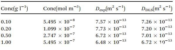 表1根据实验G与t1/2曲线计算的不同浓度的扩散系数D(m2 s-1)值与使用DLS测量的值相比