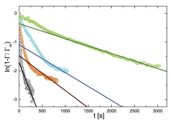 图6表明,这种势垒控制机制确实长期存在。开放符号是ln(1-Γ/Γmax)的实验值。在很长的时间内,曲线拟合一条由实线表示的直线。实线的斜率可以确定为1/k的动力学弛豫时间的倒数。