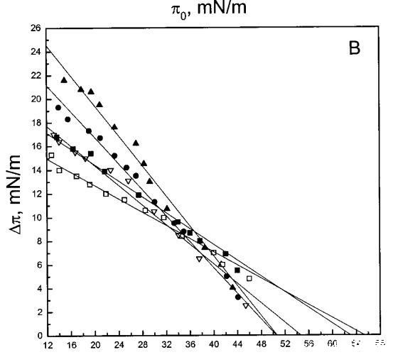 单层实验显示,magainin 2和吲哚西啶具有高度的膜活性(图1),在空气/水界面上的脂质膜下注射后,表面压力显着增加。根据膜的组成,发现了与表面压力πc对应的临界堆积密度,超过该密度,这些肽不再与单层相互作用,从而导致π的增加(Verger和Pattus,1976)。尽管这两种肽插入两性离子磷脂酰胆碱单分子膜,但它们优先与酸性磷脂相互作用,与其净阳离子电荷保持一致(Matsuzaki等人,1991、1993、1995a、1998;Ladokhin等人,1997)。然而,PG对其穿透力的影响明显不同,吲哚西丁在~38 mN/m的表面压力下有一个交叉点,吲哚西丁的斜率为∆存在PG时,π与π0的比值变得更陡(图1)。相比之下,斜坡∆?与π0相比,magainin 2的穿透力未因PG的存在而改变(图1A)。我们的数据表明,magainin 2更表面地附着于单层,其穿透深度增加PG,并随着表面压力的增加而逐渐减小,其长轴相对于层平面的角度在不同压力下保持相对不变。上述magainin 2与脂质单分子膜的相互作用模式可兼容1)其主要为=-螺旋构象,PG增加=-螺旋度(Wieprecht et al.,1997),和2)该肽在其长轴平行于层平面的情况下向脂质双层的浅层渗透(Bechinger等人,1993年;Matsuzaki等人,1994年)。在π>πc时,magainin 2仍可能与单层中的PG静电结合,尽管没有穿透膜,因此不会导致π增加。最后,我们的数据还表明,与双层不同,magainin 2不会在脂质单层中采用垂直方向(即其=-螺旋的长轴垂直于层平面)。