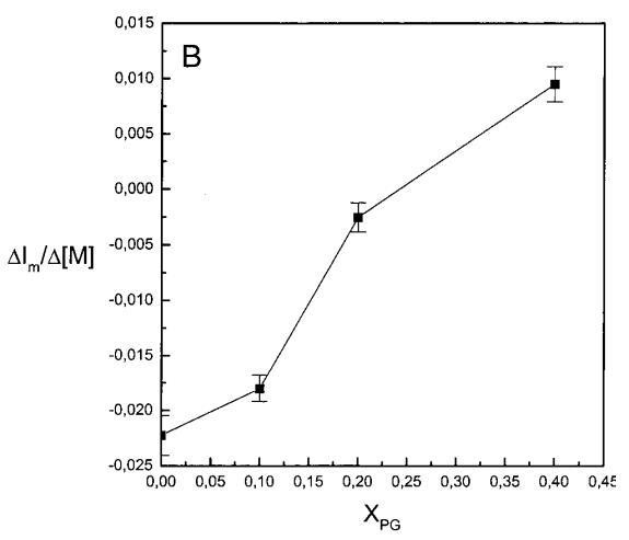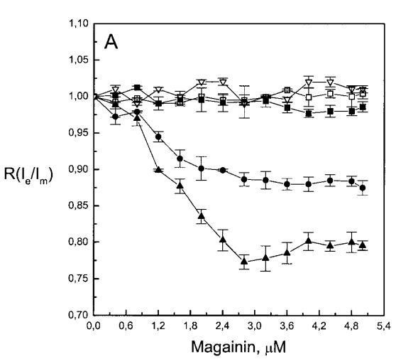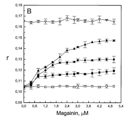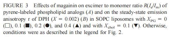 有趣的是,在存在酸性磷脂的情况下,肌动蛋白/脂质的摩尔比(在该摩尔比下,肌动蛋白的初始增量趋于稳定)分别为1:21、1:16和1:12.5,对应于XPG=0.1、0.2和0.4(图2A),分别产生1:2、1:3和1:5的肌动蛋白/磷脂化学计量比。同时,DPH的初始r增量在magainin/脂质摩尔比为~1:30、1:12和1:5时趋于平稳(XPG分别为0.1、0.2和0.4),对应于大约1:3、1:2.5和1:2的magainin/PG化学计量比(图3)。据报道,在这些肽/脂质摩尔比下,magainin可插入含酸性磷脂的膜中(Ludtke等人,1994年)。此外,已经证明,双分子层中magainin的=-螺旋的方向取决于肽与脂质的摩尔比,在上述化学计量比下,螺旋应垂直于膜表面插入,在含PG的膜中形成孔(Ludtke等人,1996)。这些孔不仅由两亲螺旋的极性面组成,而且还由脂质的极性头基组成,内外单层通过这些孔衬脂质是连续的。膜中的这种结构可能会降低探针芘部分微环境的极性,从而提高其量子产率。有趣的是,当XPG>0.1时,magainin 2逐渐降低Ie/Im值(图3 A),这与增强的酰基链顺序减少脂质侧向扩散的速率一致。然而,由于magainin 2已经在XPG=0.1时增加了r,Ie/Im没有变化,我们可以得出结论,PPDPG探针向微区富集以及其横向扩散的减少正在发生。