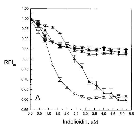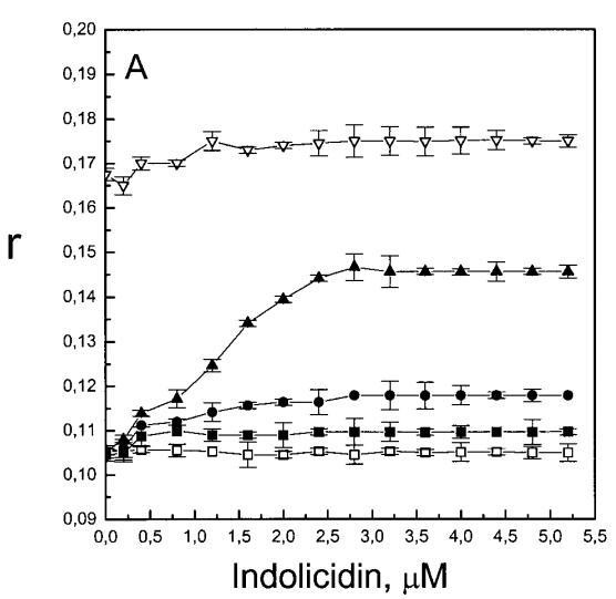 与magainin 2类似,吲哚青霉素与阴离子和两性离子囊泡的膜结合非常不同(图1b、4和5),与先前的平衡透析研究一致(Ladokhin et al.,1997)。虽然芘荧光的猝灭显示吲哚肽被分配到SOPC双层中,但对膜酰基链顺序几乎没有影响(图5)。相反,吲哚西啶与阴离子膜的相互作用导致脂酰链顺序增加,明显表现为DPH荧光各向异性增加,并对XPG呈S形依赖(图5)。与magainin 2相反,吲哚西丁导致芘单体和准分子发射强度显着平行降低,与脂质成分无关,Ie/Im变化较小(图4)。相应地,吲哚西丁诱导酸性PG富集到微区。有趣的是,在吲哚西丁/脂质摩尔比为1:20以下,芘Im的减少顺序为XPG=0.40.20.10(图4a),而在吲哚西丁/脂质摩尔比为1:10时,Im的减少对XPG的依赖性相反。这种变化的可能机制如下。在低肽/脂摩尔比时,吲哚西丁似乎被调节到双层界面(Ladokhin等人,1997),芘标记链的链反转(Holopainen等人,1999)使该部分更接近双层表面,从而允许其与吲哚西丁的基本残基接触。后者通过π-阳离子相互作用导致芘部分的碰撞猝灭。然而,随着XPG的增加,我们可以预期PG头基与吲哚西丁的碱性残基发生静电结合,从而阻止芘与吲哚西丁的阳离子残基之间的直接接触。随着肽浓度的增加,吲哚肽的膜结合以协同方式增强,猝灭效率的逆转可能涉及双分子层中脂肽复合物的聚集。因此,在酸性含磷脂的膜中,吲哚对芘的猝灭作用较小。当吲哚肽的浓度增加到肽/脂比1:10以上时,肽将以高度协同的方式并入膜的酰基链区域(Ha等人,2000)(图9 E),而在中性膜中,肽位于界面(图9 D)。插入吲哚西丁的量取决于双层中的XPG,导致吲哚西丁的Trp残基的猝灭占主导地位,与XPG=0.4时Im的显着减少一致(图4a)。