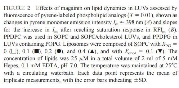 继上述单层研究之后,有兴趣探索肽对脂质动力学的影响。这是通过使用荧光光谱和不同脂质成分的LUV完成的,记录芘标记的荧光磷脂类似物PPDPC或PPDPG的发射光谱(均为X=0.01)。对于SOPC LUV,添加magainin 2导致芘荧光显着猝灭,芘单体和准分子发射强度平行降低,如Im所示(图2)。作为XPG的一项功能,还研究了马盖宁2与脂质体结合的后果。当XPG从0.1增加到0.4时,观察到由于magainin 2在398 nm处逐渐增强的Im(RFIm),而Im的初始增量在明确定义的PG/magainin 2化学计量比~2、3和5时趋于平稳(图2 A)。在这个初始阶段之后,直到给定的化学计量比,还有第二个过程,其斜率也随着XPG的增加而增加(图2b)。在XPG=0和0.1时,Magainin 2仅引起Ie/Im的轻微变化,而在XPG=0.2和0.4时,分别减少10%和25%是明显的(图3 A)。为了区分脂质动力学中两种性质不同的变化,即侧向迁移率和微结构域形成,作为上述Ie/Im变化的根本原因,我们还通过测量DPH的荧光各向异性r来评估酰基链顺序的变化(图3 B)。在缺乏酸性磷脂的情况下,Magainin 2几乎不会引起r的变化(图3B)。然而,随着XPG的增加,加入magainin 2后脂质堆积和酰基链顺序逐渐增加(图3b),XPG=0.4时,r最大增加1.4倍。值得注意的是,XPG=0.1时Ie/Im没有变化以及酰基链顺序的增加表明PPDPG正在发生微观富集。有趣的是,在存在胆固醇(Xchol=0.1)的情况下,由于马盖宁2的作用,Im和Ie都显着降低,Ie/Im的变化不显着(图2A和3A)。如前所述(van Ginkel et al.,1989),添加肽前r的增加(图3 B)揭示了通过在膜中掺入胆固醇而增强的膜顺序。然而,在胆固醇存在的情况下,magainin 2对r没有进一步的影响(Xchol=0.1,图3b)。