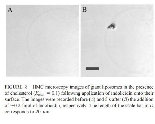 随后,我们研究了吲哚西丁对由SOPC和胆固醇组成的巨大脂质体(Xchol?0.1)的影响。吲哚西丁在胆固醇存在的情况下也会引起巨大脂质体的起泡。形成的内吞小泡在巨大小泡的表面上深度聚集(图8b)。具体地说,在添加约0.2 fmol吲哚西啶(~400 fl,20次注射,图8 B)后约5 s内,巨大脂质体表面出现一簇小颗粒。随后,聚集物转移到巨大的脂质体中,同时也有少量内吞颗粒(θ≈0.9米)处可见。进一步添加吲哚西丁会增加这些颗粒的数量,并导致巨大脂质体收缩。然而,即使在暴露于~2 fmol吲哚西丁(200次注射,数据未显示)的情况下,膜大体上仍保持完整。