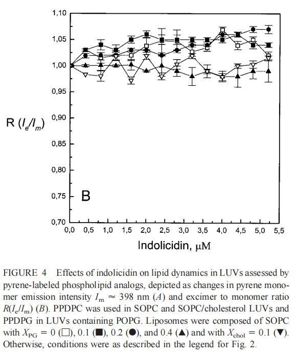 随后,我们进行了与上述相同的测量,但使用吲哚西丁。与magainin 2类似,吲哚西丁也导致SOPC LUV的Im和Ie同时减少,如图4a所示。然而,与magainin 2相反,当存在酸性磷脂POPG时,芘荧光的猝灭也很明显。当肽/脂摩尔比为1/20时,Im按XPG?0.40.20.10顺序下降。当XPG=0.4且肽/脂摩尔比>1:12.5时,Im值进一步降低。吲哚西丁引起的Im最大减量为15%(XPG=0)至40%(XPG=0.4)。尽管Im降低,但Ie/Im未显示因吲哚西丁引起的显着变化(图4b)。有趣的是,在Xchol=0.1时测量到Im的最大下降(图4a)。与magainin 2类似,当吲哚西丁添加到SOPC LUV中时,DPH各向异性r保持不变(图5a)。然而,在含有酸性磷脂的膜中,吲哚西丁导致脂质堆积增加和酰基链顺序增加,明显表现为r增加(图5a)。此外,r的增加取决于XPG,随着双层中酸性磷脂含量的增加而增加(图5b)。相应的最大增幅为1.05倍至1.39倍。在胆固醇存在的情况下,也观察到吲哚肽引起的膜酰基链顺序的增加,使r增加1.06倍(图5a)。