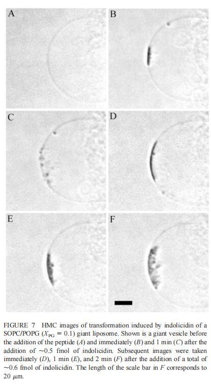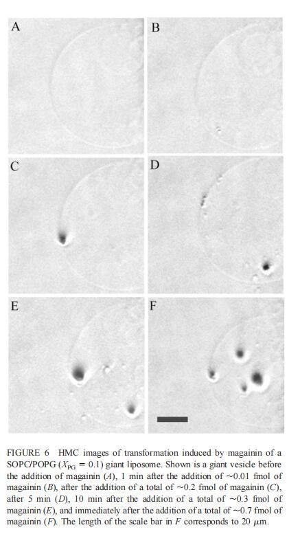由于上述magainin 2和吲哚西啶对单层和LUV具有明显的脂质成分依赖性作用,因此有兴趣使用巨型脂质体比较这些肽对宏观膜的三维拓扑结构的影响,无论是否含有PG,都可以在交流电场中形成由SOPC组成的巨大脂质体。即使暴露于大量肽(~2 fmol,~4 pl=200次重复注射,数据未显示),SOPC膜也不受magainin 2的影响。同样,由SOPC和胆固醇(Xchol=0.1)组成的巨大脂质体也不受此量的马盖宁2的影响(数据未显示)。然而,在存在POPG(XPG=0.1)的情况下,已经~0.01 fmol(单次~20 fl注射)的magainin 2应用于巨大囊泡表面,显着影响巨大脂质体膜的拓扑结构(图6 B)。更具体地说,在~1分钟内,小颗粒(θ≈0.9米)出现在巨大的囊泡内。随后注射高达~0.1 fmol(约200 fl)的magainin 2不会引起进一步的可见变化。在总共添加约0.2 fmol的肽后,膜开始起伏,形成致密颗粒(θ≈4 m)在巨大脂质体内可见(图6 C)。在~5分钟内,几个小颗粒(θ≈0.9 m)出现在巨大脂质体膜的内表面(图6 D)。随后,大多数小颗粒进入巨大囊泡的内腔。这些内吞小泡似乎在巨大脂质体内自由移动,在随后30分钟的观察中没有进一步的变化。进一步注射magainin 2,提供总共0.3 fmol的肽,引起类似内吞作用的过程,出现直径约8 m的致密颗粒(图6 E)。约10分钟后,巨大脂质体内约0.9-m颗粒的数量继续增加。偶尔,这些颗粒也出现在巨大囊泡的外表面,并释放到外部缓冲液中(图6 E)。随后添加magainin 2(~0.7 fmol)使膜不稳定并诱导进一步的囊泡形成(图6 F)。这些内吞囊泡在巨大脂质体内彼此分离,巨大囊泡的大小明显减小(图6f)。最终,在进一步添加magainin 2(高达~1.5 fmol)后,巨大的脂质体膜崩塌。上述形态学变化具有高度的可重复性。