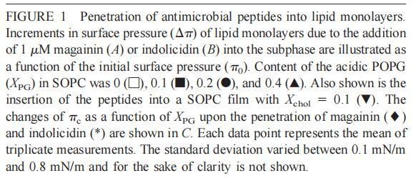 通过测量表面压力的增量,观察到抗菌肽在不同初始表面压力(π0)下嵌入到空气/水界面上的脂质单层中(∆π)将肽添加到亚相后(Brockman,1999;Verger和Pattus,1976)。Magainin 2在π0>12 mN/m时容易插入SOPC单层(图1A),而在π0以上≈35 mN/m时,其在膜中的渗透被消除,因此该值表示该肽与SOPC膜相互作用的临界包装压力πc。根据其净正电荷4(Matsuzaki,1998),当膜中酸性磷脂POPG的含量增加时,magainin 2向脂质单层的渗透逐渐增强(图1 A)。因此,消除magainin 2插入单层的πc值增加至~39(XPG=0.1)、43(XPG=0.2)和46 mN/m(XPG=0.4)(图1c)。相反,在SOPC膜中加入胆固醇(Xchol=0.1)对magainin 2的渗透没有显着影响(图1A)。