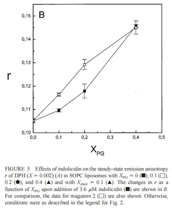虽然荧光光谱显示,马盖宁2和吲哚西啶对脂质动力学的影响存在明显差异,但也存在一些明显的相似之处。因此,DPH各向异性r的增加表明,在存在酸性磷脂的情况下,这两种肽都会导致酰基链顺序的增加,这种影响的程度随着XPG的增加而增加(图3b和5b)。同样,在胆固醇存在的情况下,两种肽对芘荧光的有效猝灭也很明显(图2a和4a)。这可能与胆固醇的OH基团和马盖宁的E19残基之间的相互作用有关(Tytler等人,1995年),该肽在膜中具有跨膜取向。当Xchol=0.1时,r值的增加是由于吲哚西丁所致,而马加宁则无影响。这表明,在胆固醇存在的情况下,吲哚肽可能采用跨双层取向,其长轴垂直于双层平面。