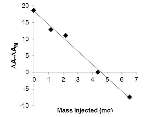 脂质体(不同浓度)对BSP蛋白的作用也如图5所示。脂质体在进入亚阶段前与精浆接触。随着脂质体中浓度的增加(曲线M/SP+C1至C4),BSP蛋白吸附引起的表面积增加逐渐延迟并减少。当含量达到4.37 mg(C3)时,界面上仍有少量BSP蛋白掺入,1600 s时出现肩部。在最高浓度(C4)下,未观察到BSP蛋白掺入,分子面积的变化甚至比对照曲线更负,表明膜组分在亚相中轻微溶解。因此,脂质体作用于BSP蛋白的方式与LDL相同。最有趣的比例似乎介于C3和C4之间。根据确定面积变化与脂质体注射磷脂质量之间相互作用的曲线计算得出(图6)。注射26.6 mg BSP的最佳质量为4.6 mg,即PC:BSP比为0.16(w/w)。