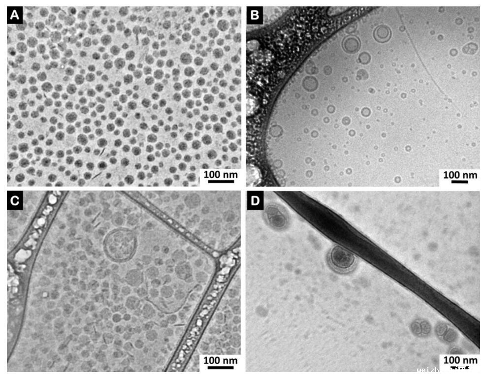 图7。(A)低密度脂蛋白,(B)脂质体,(C)低密度脂蛋白和精浆(精浆中的比例为0.17 mg PC/mg BSP蛋白质)和(D)脂质体和精浆(精浆中的比例为0.16 mg PC脂质体/mg BSP蛋白质)的冷冻电镜图像。