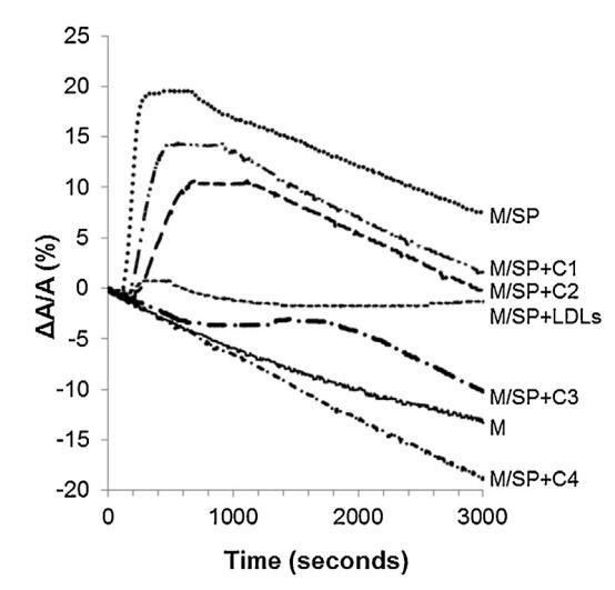 图5。注入(…)后,由单层(M)覆盖并在不含(-)额外分子的缓冲液上形成的界面的相对表面积随时间的变化SP(26.6±1.5 mg蛋白质)、SP(26.6±1.5 mg蛋白质)和不同浓度(··-)C1、(·-)C2的脂质体的混合物,(·-)C3和(·-)C4(分别为1.17±0.02 mg、2.18±0.02 mg、4.37±0.02 mg和6.55±0.02 mg脂质)和(---)LDL(4.6 mg PC)和SP(26.6±1.5 mg蛋白质)的混合物。气温是34度◦C在空气-缓冲器接口处。表面压力保持在25 mN/m。