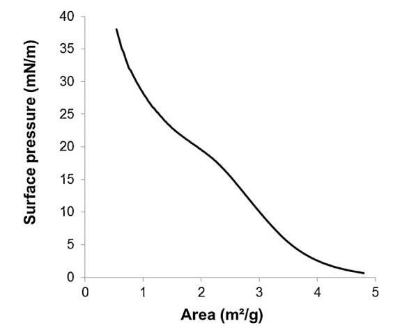通过传播精浆在空气/缓冲液界面形成的单层的表面压力面积(?–A)等温线(n=3,标准偏差在0-18.9 mN/m范围内不超过1.5 mN/m,在18.9-38 mN/m范围内不超过1.2 mN/m)。