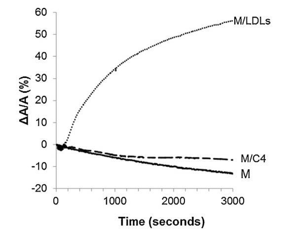 将低密度脂蛋白和脂质体引入精子膜仿生外小叶亚期的影响如图4所示。对于控制测量(未注入任何保护剂,设计为图4中的M),表面积随时间略微减小。当低密度脂蛋白被注射到重建的外小叶下方的亚相(图4中的曲线M/LDL)时,它导致表面积快速而大的增加。相反,与参考单层(曲线M)相比,脂质体的注射(图4中的曲线M/C4)几乎没有改变单层的膜压力。脂质体与单层脂质体的结合动力学比低密度脂蛋白慢得多。因此,在与精液制备相对应的时间尺度上,脂质体在空气-水界面上的吸附较弱。