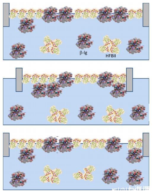 图7。重复压缩和膨胀后HFBII:WPI混合层结构形成示意图。请注意,乳清蛋白的主要成分BLG仅在此处显示。压缩:BLG的一部分从表面排出,形成一个子层。膨胀:BLG的一部分停留在亚表层,而另一部分可能重新吸附到主层。顶面存在HFBII的净浓度。