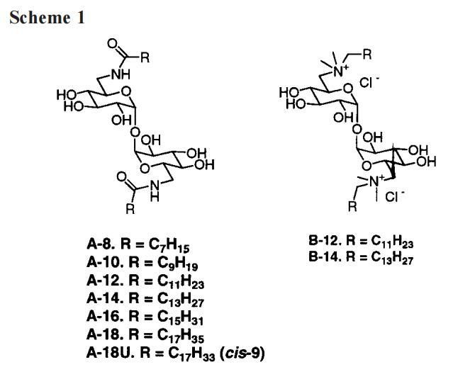 本文研究以海藻糖为间隔基的双子座(方案1)。A系列由海藻糖组成,其6-和6′-羟基被长链酰胺取代。B系列在6-和6′位置有长链季铵盐基团。我们选择海藻糖作为糖间隔物并不是随意的。首先,海藻糖是一种双糖,允许两条烃链相隔相当长的距离。双子座中受限的分子内链/链相互作用是一种结构特征,过去仅对其进行了简要研究。15秒后,海藻糖(一种从细菌、藻类、昆虫和植物等多种自然来源中分离出来的糖)可以保护生物膜免受脱水的压力。16因此,在生物膜的“细胞模拟”建模方面,我们对海藻糖双子感兴趣。17第三,从实用的角度来看,海藻糖很有吸引力,因为它包含两个完全相同的D-葡聚糖单元。这简化了化合物的合成和分析,与大多数其他双糖相比,化学性质不同的羟基数量减少了一半。但尽管对称,合成纯海藻糖双子座的途径(方案2和方案3)无疑是随后物理化学的一个乏味的序言。