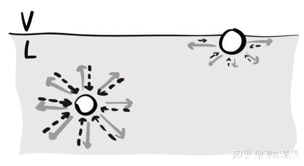 位于液体表面的分子,其所受到的排斥力较小,缺少来自上方的排斥力,而这个斥力随着深度加深而增大。根据受力平衡:垂直方向——吸引力随着不断深入液相体相而增大,直至达到饱和值。同一深度水平方向——没有必要通过吸引力来抵消排斥力,因为来自各水平方向的排斥力自己可以相互抵消(且强度随着深入液相深度的变化与垂直方向的情形相同);但是在水平方向的吸引力,由于水平方向周围粒子的分布密度比垂直方向要高,就可以大于排斥力,因为吸引力是容许各向异性的(即各个方向的力的强度可以不一样)。于是可以看出,合力的作用方向,即表面张力的方向,平行于表面。也就是说——是这个引力作用,使表面趋于缩小。