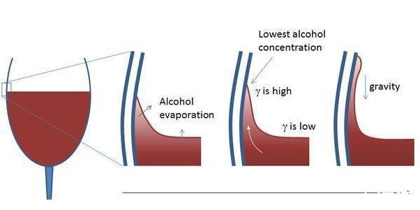 同样的位于酒杯边缘的液体它的表面张力会更大。而靠近酒杯中心的液体它的表面张力就会相对来说较小,同属于一种液体由于其位置不同,就会产生马拉高尼效应,酒杯中间的液体会被吸附到酒杯边缘,因此就会出现我们说的好酒会挂壁的现象,通过讲明白这个现象,我们也清楚了挂壁其实并不能成为评定一款酒好坏的标准。这只能证明这款酒的酒精度数高而已。